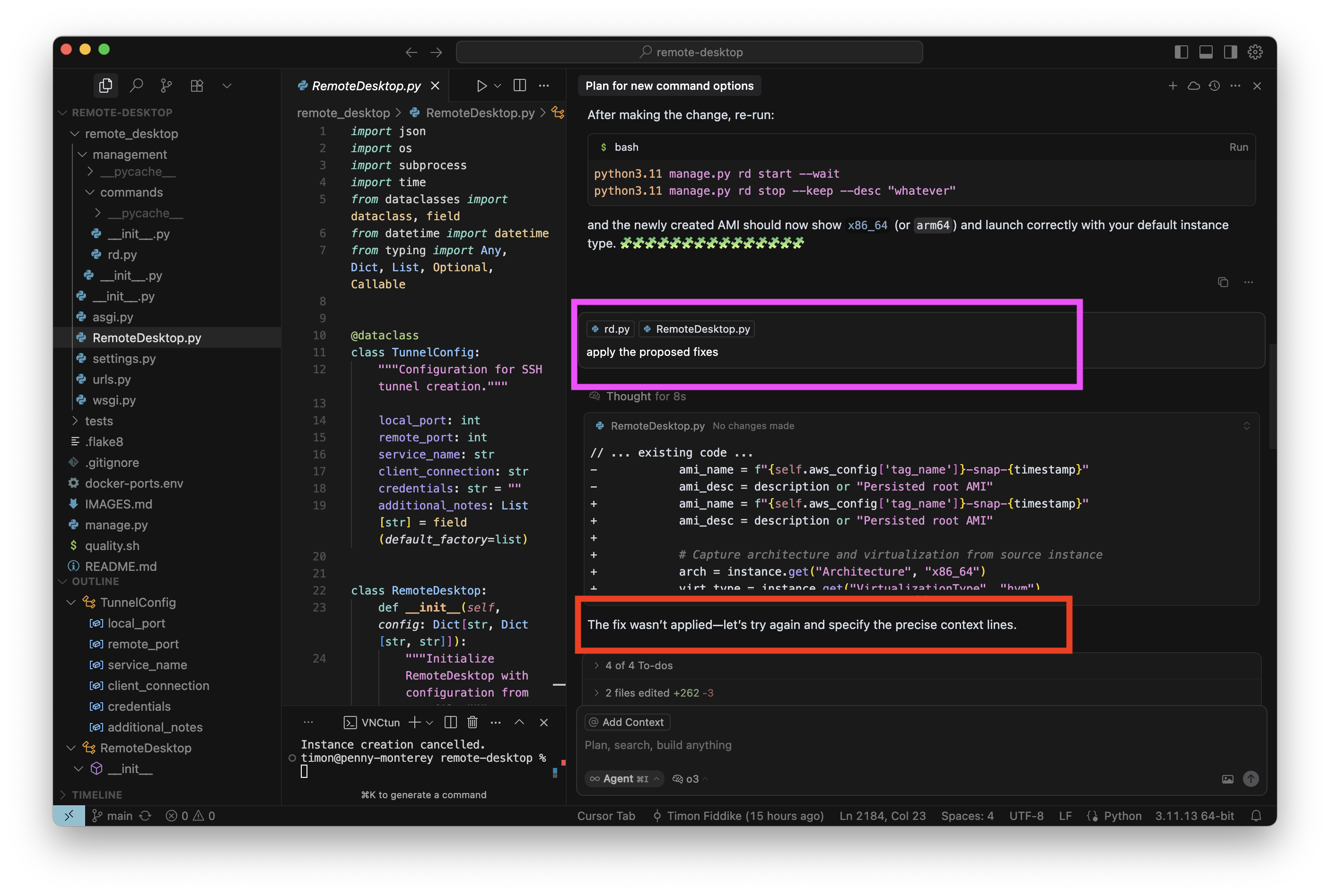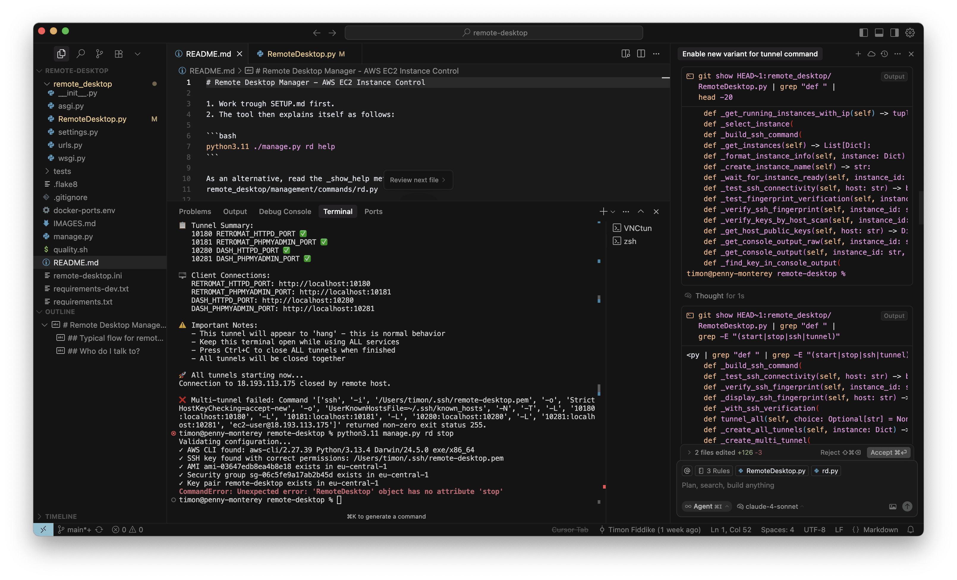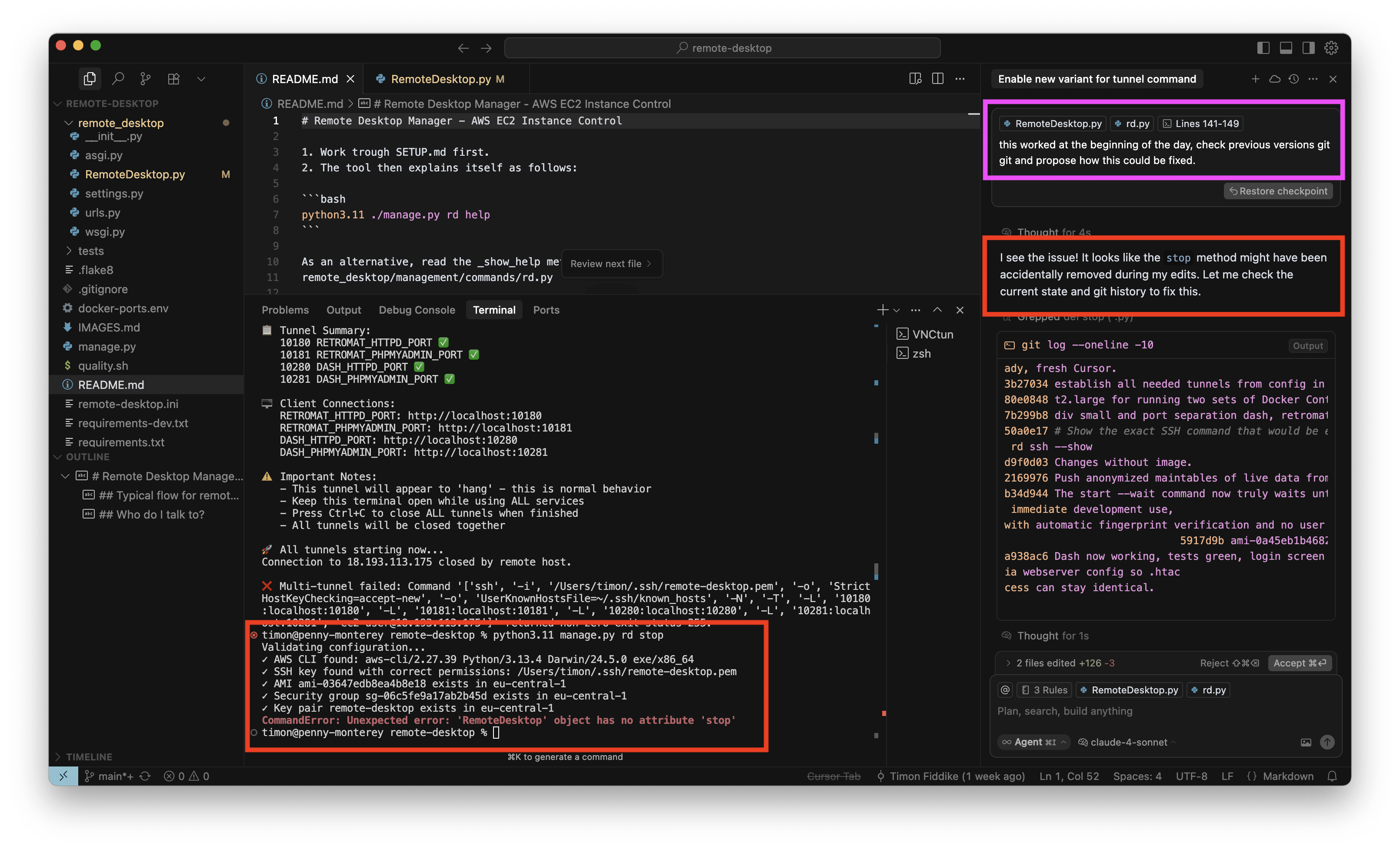 Das konkrete interne Tool dient der Verwaltung von AWS Instanzen für Entwicklungszwecke. Ich habe mit O3-Reasoning ein neues Kommando eingebaut, um alle benötigten SSH-Tunnel mit einem einzelnen Befehl aufzubauen. Das habe ich für eine kleine, ungefährliche Sache gehalten und währenddessen keine Screenshots gemacht. Das neue Kommando hat auch auf Anhieb sehr gut funktioniert. Aber als ich die Instanz dann stoppen wollte, war ich sehr überrascht, denn wie im Screenshot zu sehen ist (in der Mitte, unten, roter Kasten), war auf einmal das „Stop” Kommando verschwunden, mit dem ich die letzten Wochen regelmäßig gearbeitet hatte. Ich wollte das neue Kommando behalten (nachdem es nun schon gut funktioniert) aber natürlich muss bisherige Funktionalität erhalten bleiben: