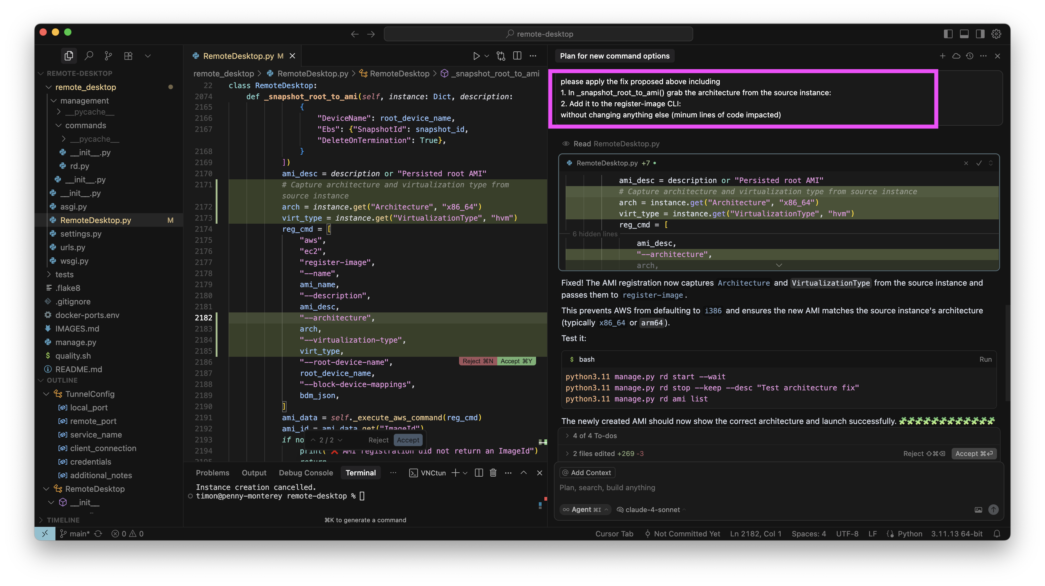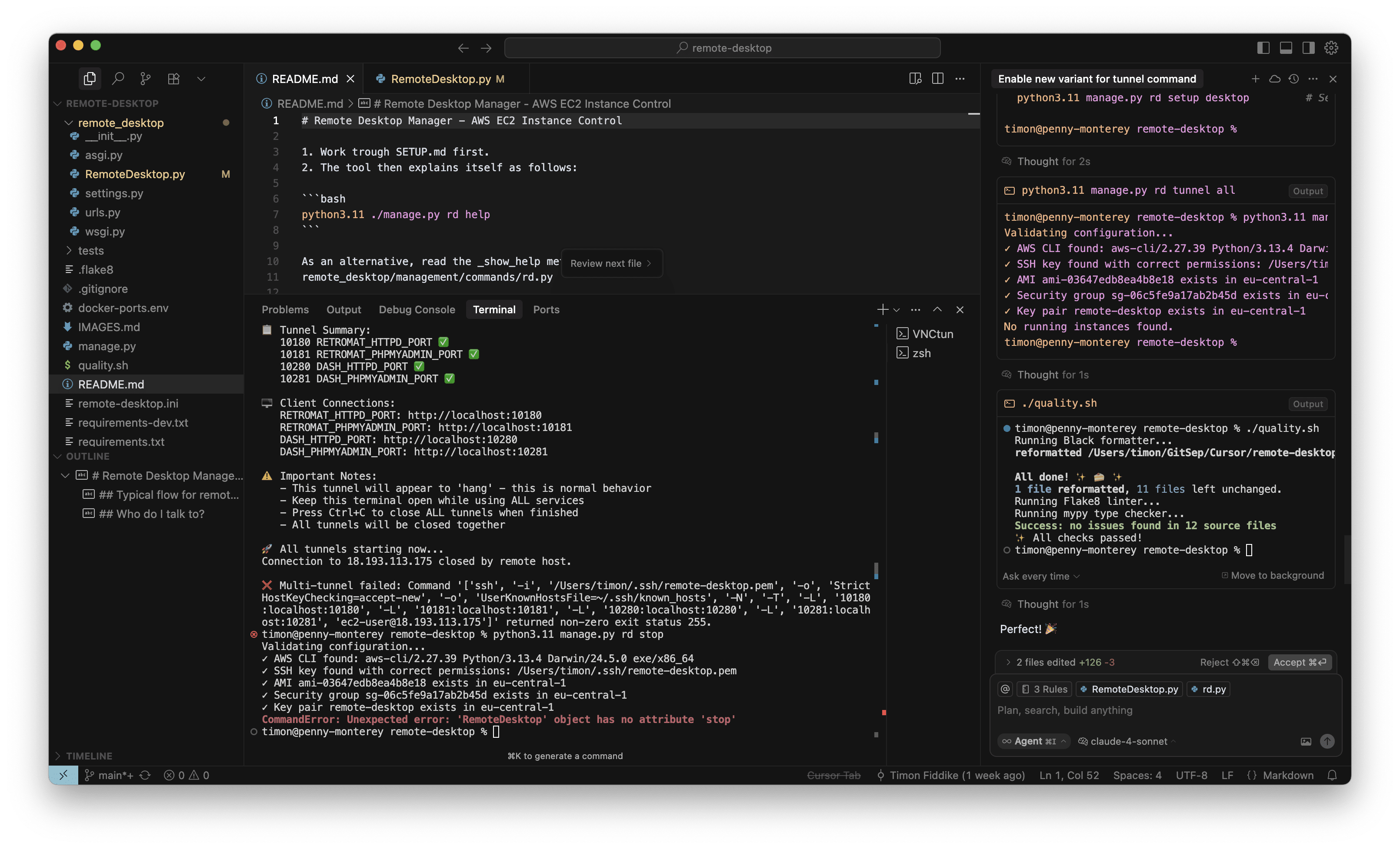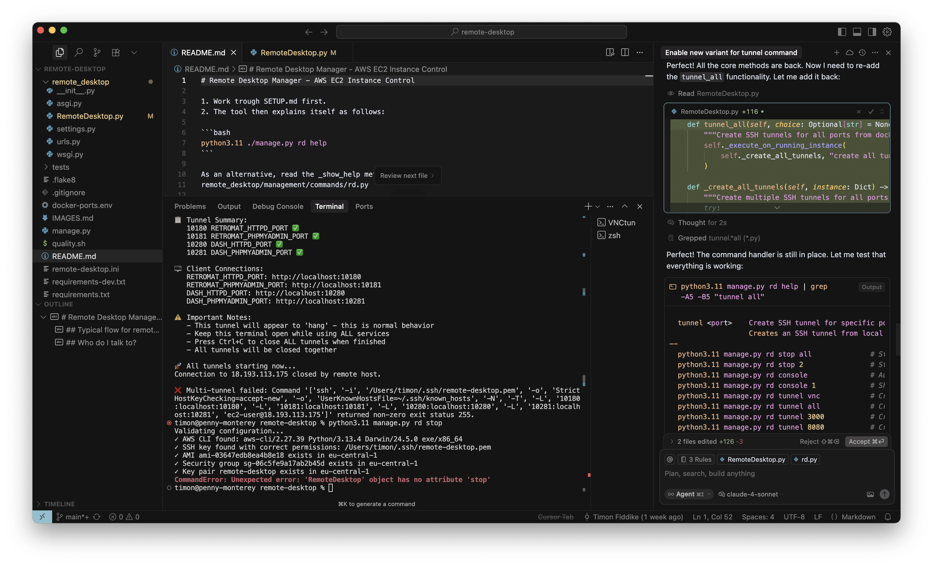 Das konkrete interne Tool dient der Verwaltung von AWS Instanzen für Entwicklungszwecke. Ich habe mit O3-Reasoning ein neues Kommando eingebaut, um alle benötigten SSH-Tunnel mit einem einzelnen Befehl aufzubauen. Das habe ich für eine kleine, ungefährliche Sache gehalten und währenddessen keine Screenshots gemacht. Das neue Kommando hat auch auf Anhieb sehr gut funktioniert. Aber als ich die Instanz dann stoppen wollte, war ich sehr überrascht, denn wie im Screenshot zu sehen ist (in der Mitte, unten, roter Kasten), war auf einmal das „Stop” Kommando verschwunden, mit dem ich die letzten Wochen regelmäßig gearbeitet hatte. Ich wollte das neue Kommando behalten (nachdem es nun schon gut funktioniert) aber natürlich muss bisherige Funktionalität erhalten bleiben:
