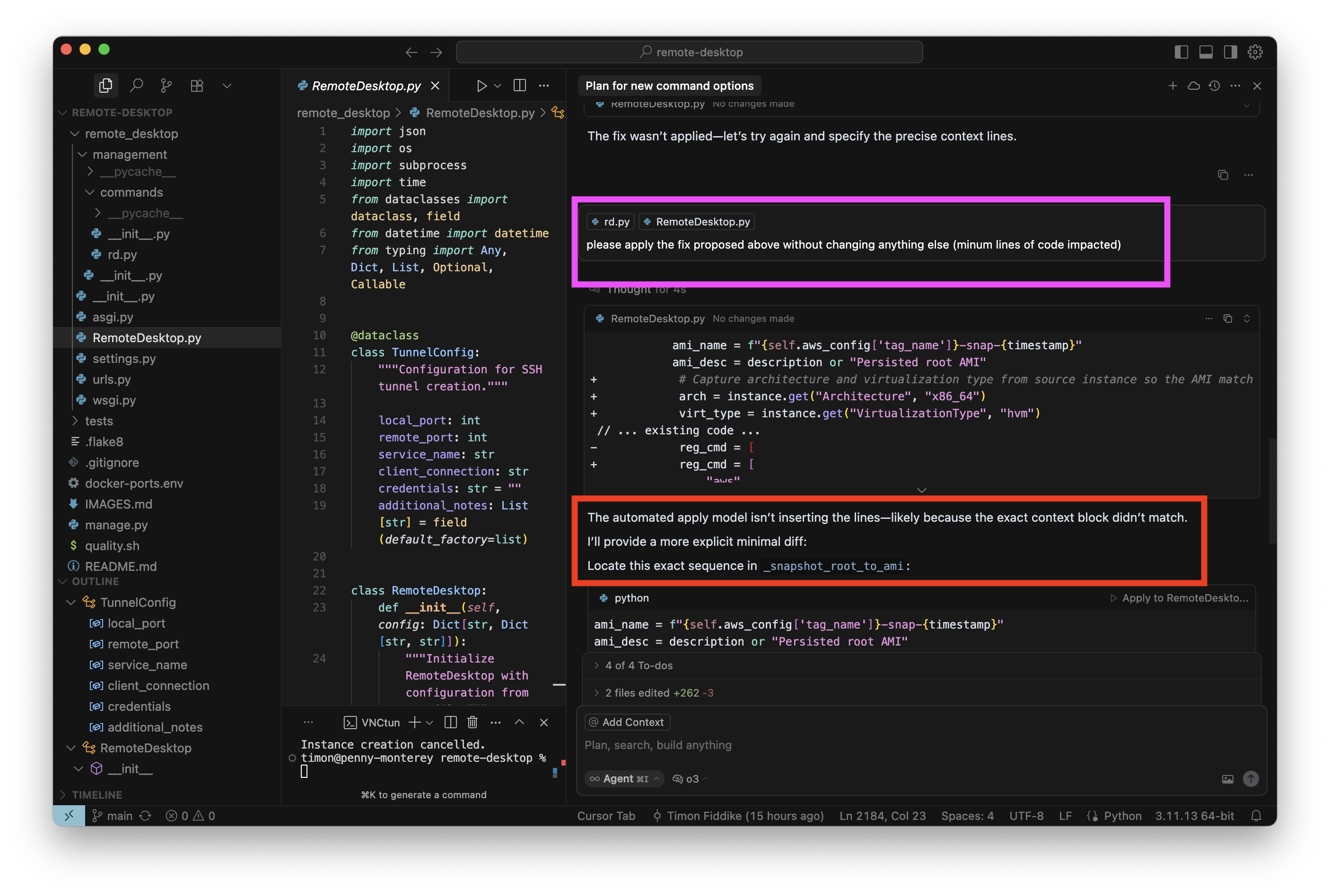 Ein paar Tage später folgte mein nächster Anlauf und damit auch der nächste Fehlschlag mit O3-Reasoning: Nach einer kurzen Planungssession habe ich den Agenten angewiesen, die vorgeschlagenen Änderungen auch gleich einzubauen. Mit anderen Modellen ist das ein banaler Routinevorgang, hier gibt es aber unerwartete Schwierigkeiten (roter Kasten rechts):
