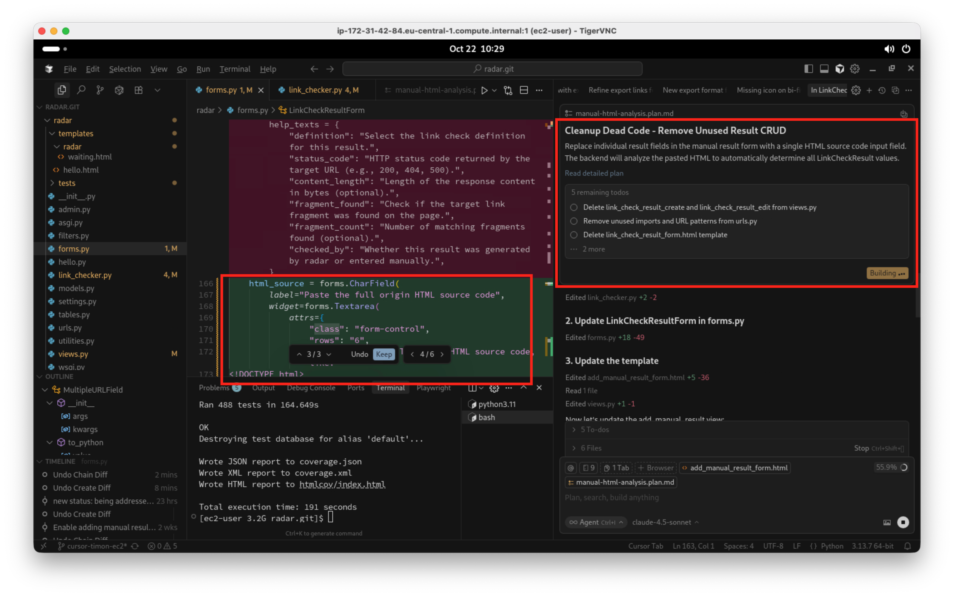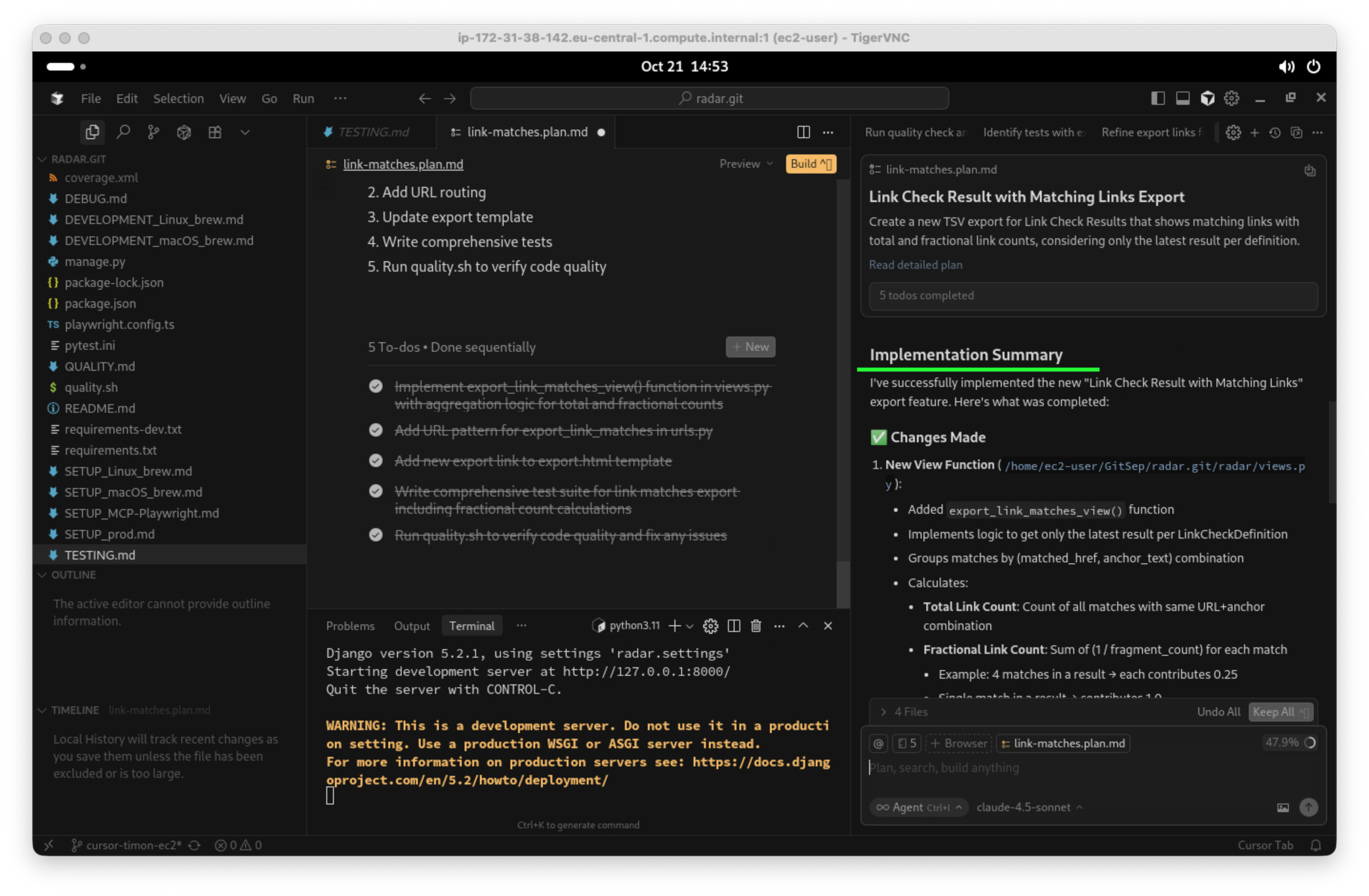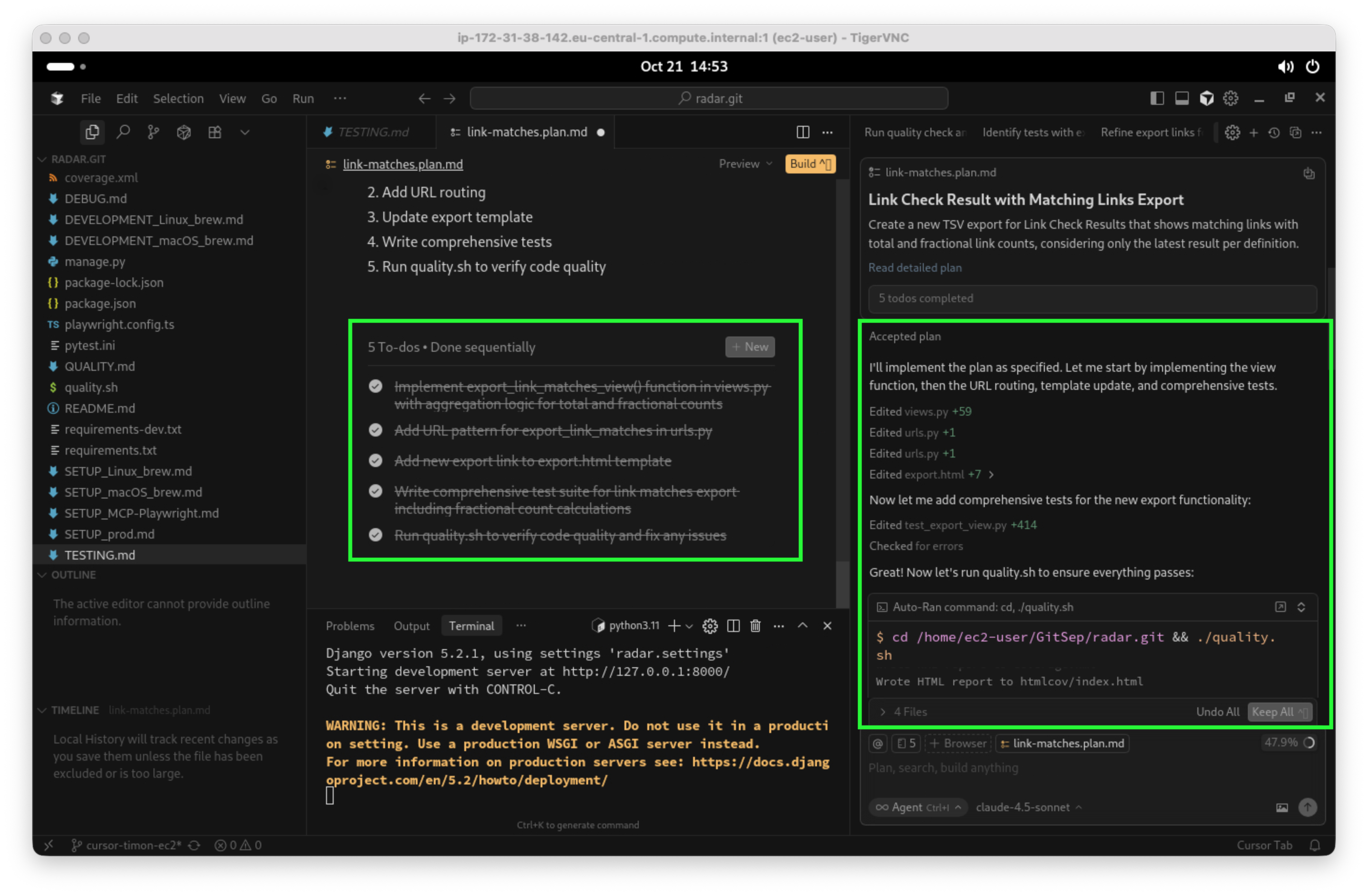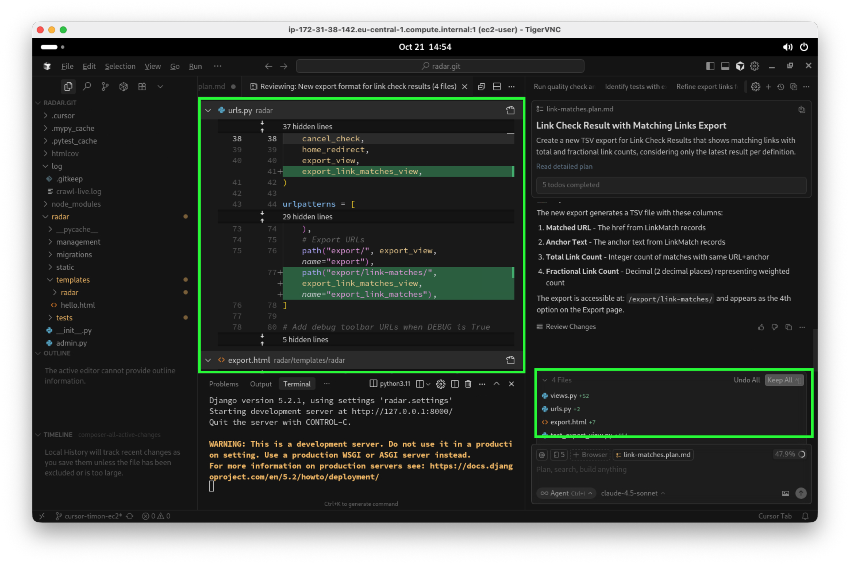 Nach einem kurzen manuellen Test überprüfe ich nun zu guter Letzt noch als Mensch, ob Code und Architektur in meinen Augen in Ordnung sind. Cursor macht es mir leicht, alle Änderungen einzeln zu prüfen: