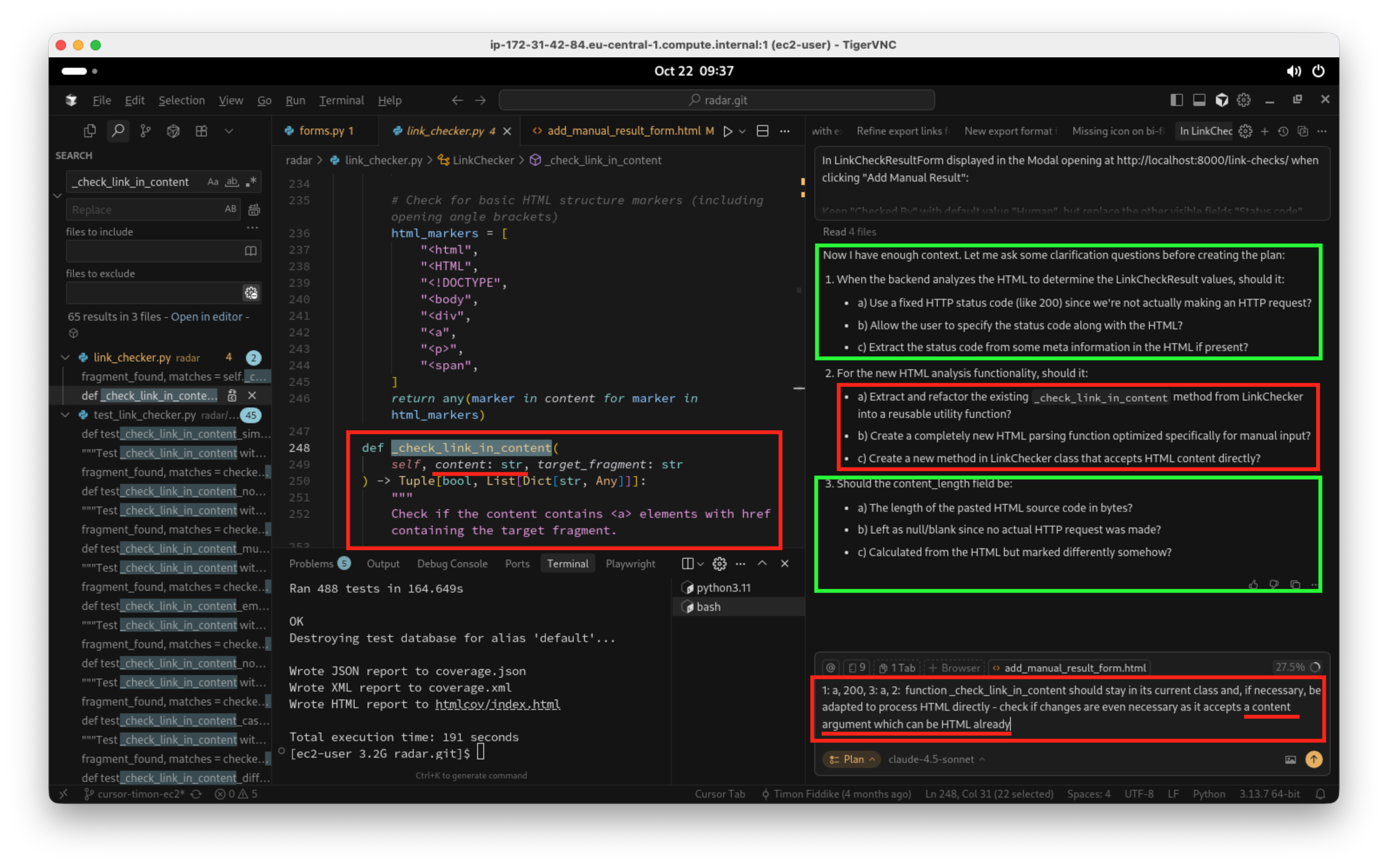 Dank Planungsmodus stellt der Agent wieder von sich aus Fragen, anders als in Beispiel 1 bin ich mit einer der vorgeschlagenen Antworten aber nicht einverstanden. Siehe rote Markierungen im Screenshot: Hier hat der Agent nicht verstanden, dass eine Funktion im Backend schon abdeckt, was nötig ist, und macht abwegige Vorschläge: