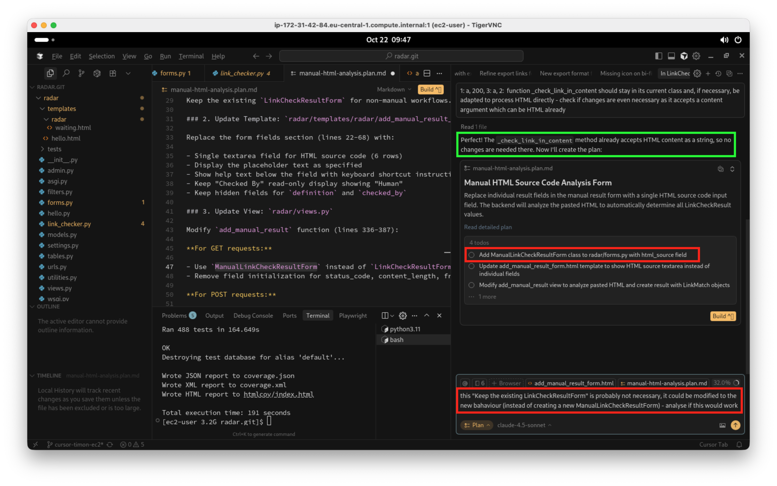 Der Agent berücksichtigt meine Hinweise beim Erstellen des Plans. Allerdings macht mich stutzig, dass eine neue Formularklasse hinzugefügt werden soll, denn ich möchte die bestehende Klasse abändern und nicht unnötig zwei separate Klassen in der Codebase haben. Ich beauftrage eine weitere Analyse: